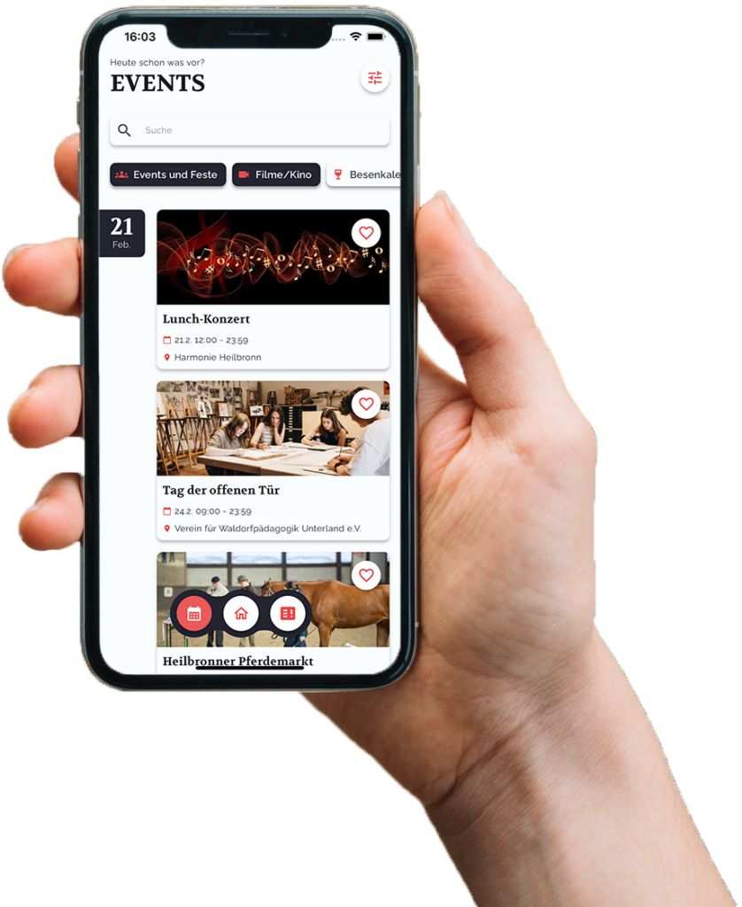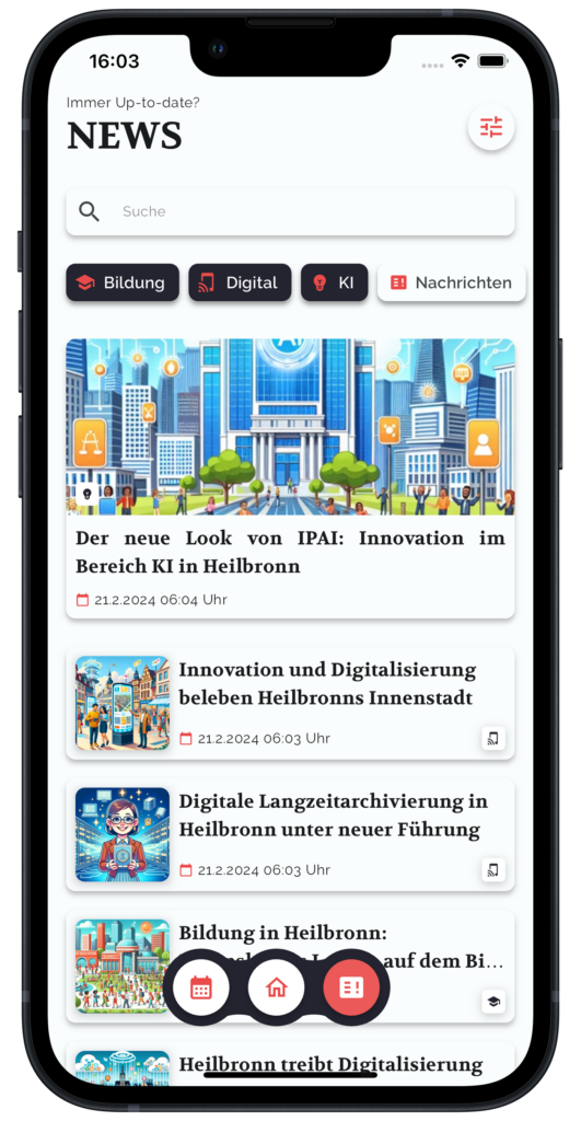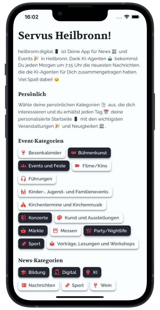 heilbronn.digital ist deine zentrale Anlaufstelle für Events und News in der Region. Die App ist das Ergebnis eines Projekts, das von Studierenden der Hochschule Heilbronn in Zusammenarbeit mit SevenD während ihres Praxissemesters entwickelt wurde. Mit heilbronn.digital liefern Dir unsere KI Agenten mehrfach täglich Updates aus verschiedenen Quellen direkt auf dein Smartphone – übersichtlich, aktuell und ganz nach deinem Geschmack personalisiert.
