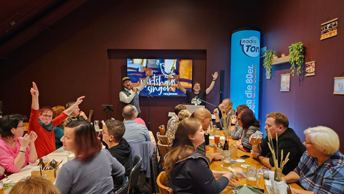 „Wirtshaussingen“: Gemeinsam Singen, ohne Noten und gut lesbaren Texten, begleitet von einer kleinen Liveband. Das Mitsingen ist jederzeit möglich. |